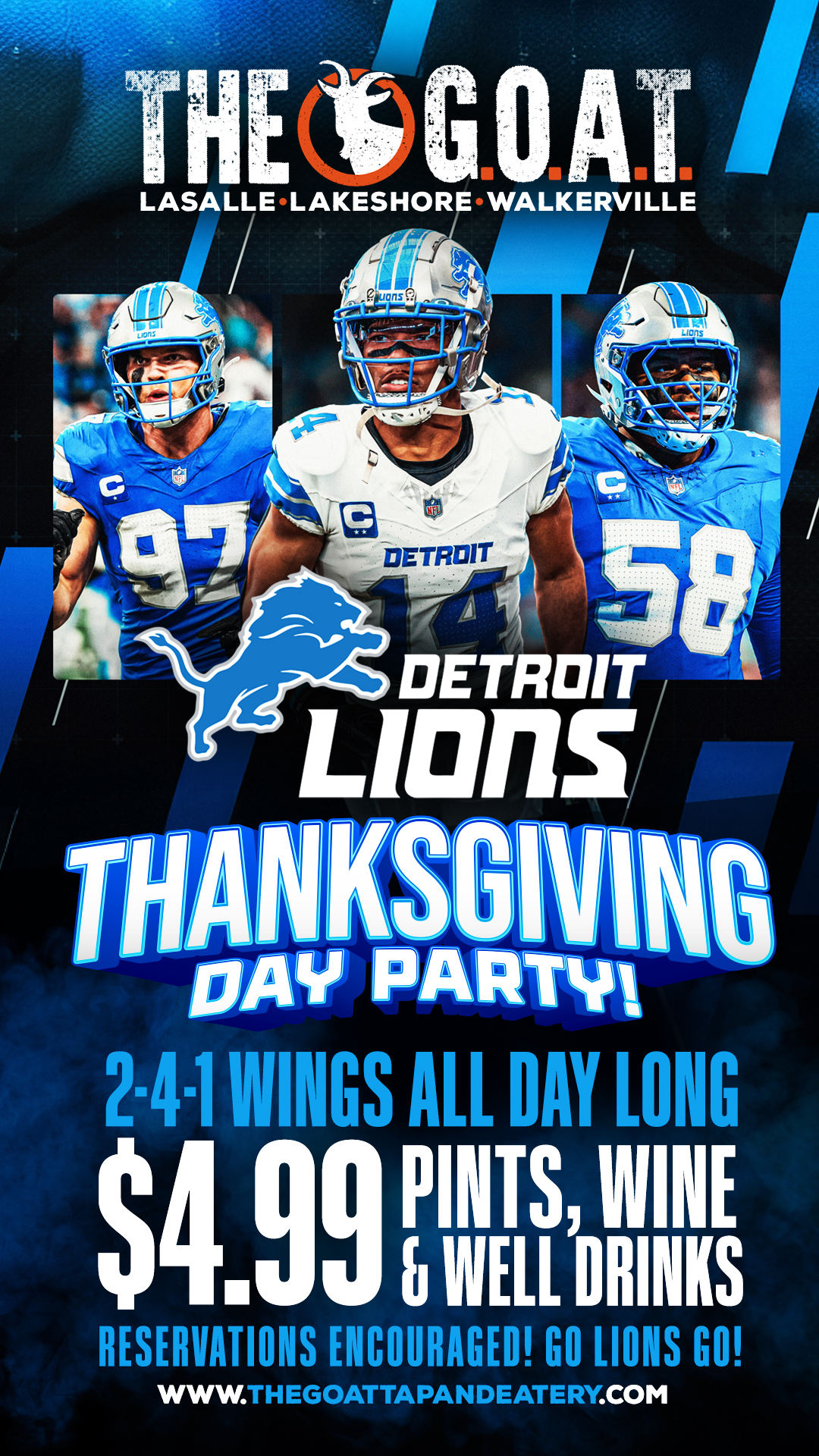 Get ready to celebrate one of Detroit’s biggest traditions as The GOAT Tap & Eatery hosts the Detroit Lions Thanksgiving Day Party on November 27! We’re turning all 3 locations into the ultimate fan zone with 2-4-1 wings all day and $4.99 pints, drinks, and wine. Bring your crew, grab your seats early, and cheer on the Lions surrounded by great food, big plays, and 16 HD TVs showing the action from every angle. This is the game day experience every Detroit fan deserves. Reservations encouraged! Full details at www.thegoattapandeatery.com.