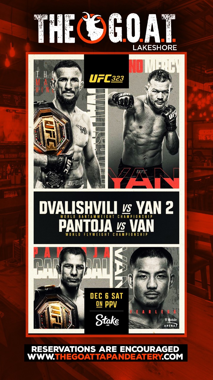 The GOAT Tap & Eatery Lakeshore is your home for UFC 323 on December 6. Catch every strike, takedown, and championship moment as Dvalishvili vs Yan 2 and Pantoja vs Van go head-to-head for UFC gold. Experience the action on our HD screens with the unbeatable Lakeshore atmosphere—great food, cold drinks, and a crowd that loves every second of the fight card. Bring your crew, settle in, and enjoy the ultimate UFC viewing experience.