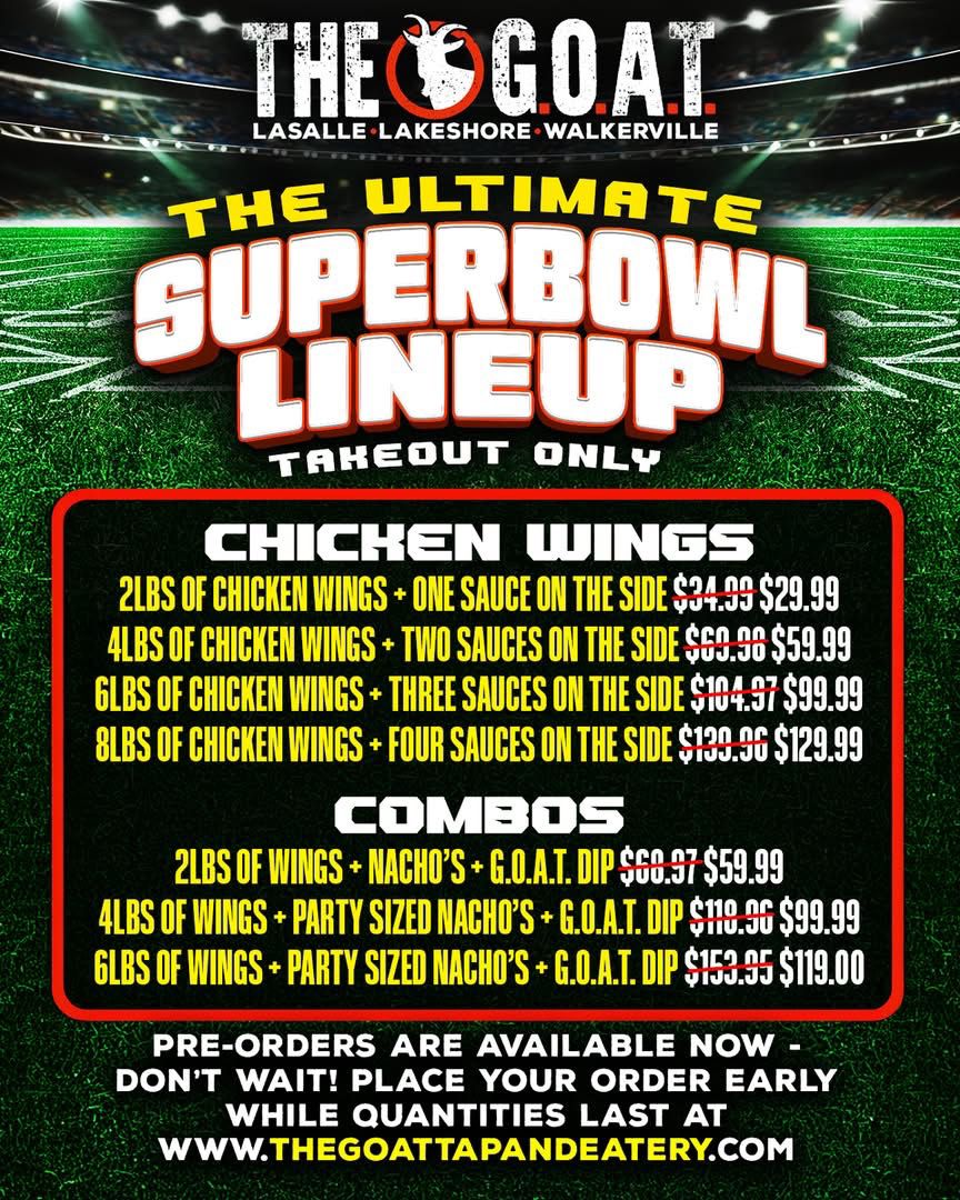 Get game-ready with The Ultimate Super Bowl Take Out Deals from The GOAT Tap & Eatery on February 8th.