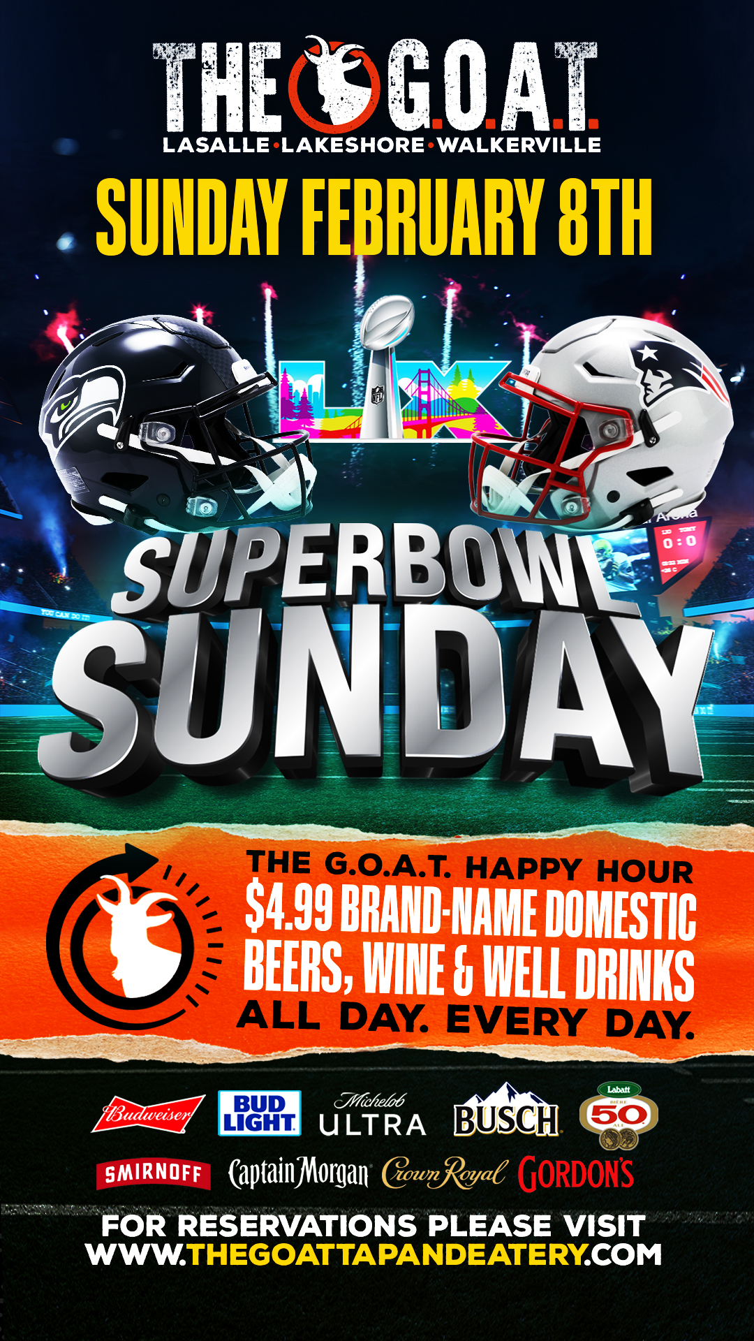 Super Bowl Sunday takes over The GOAT Tap & Eatery on February 8 for the ultimate game-day experience.