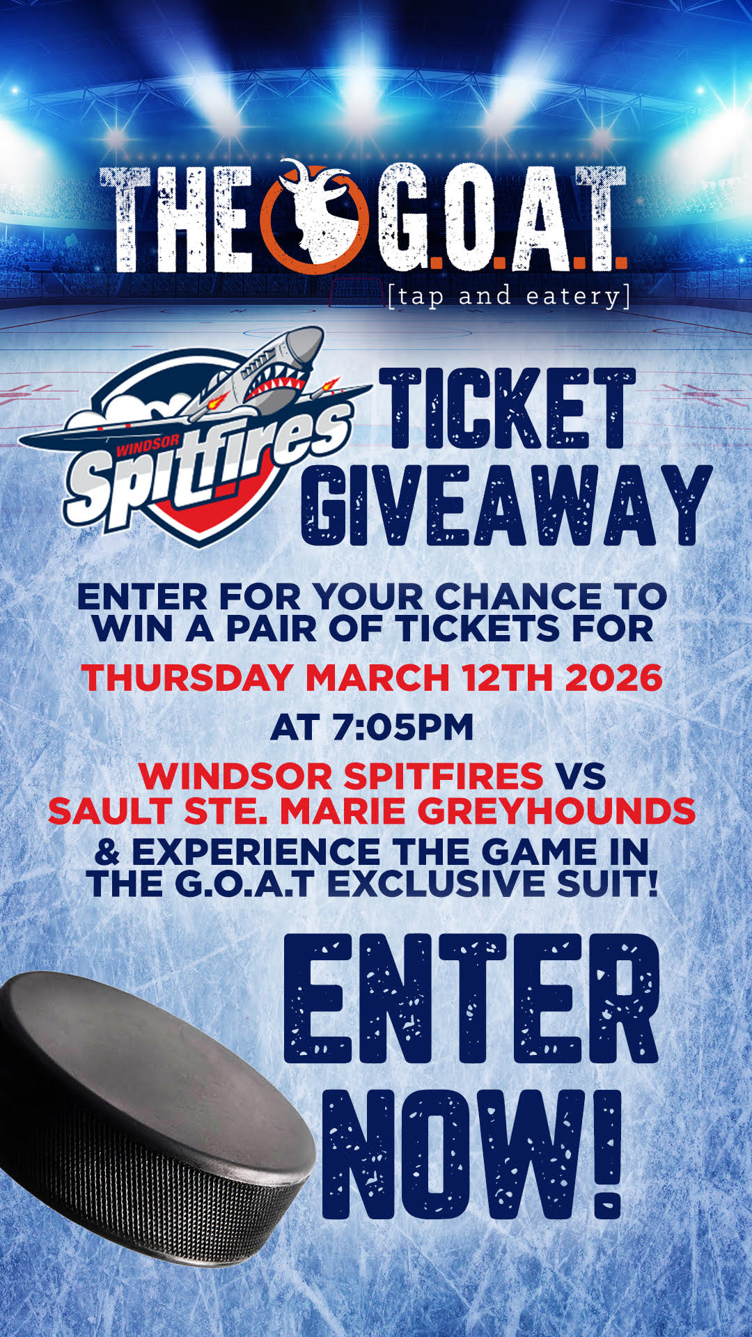 Hockey fans, this one’s for you. The G.O.A.T Tap & Eatery is giving you the chance to experience a Windsor Spitfires game like never before — from the exclusive G.O.A.T Suite. On behalf of Donato & Windsor Spitfires, we’re giving away 10 pairs of tickets to an exciting matchup between the Windsor Spitfires and the SaultContinue reading “Cheer On The Windsor Spitfires With The G.O.A.T!”