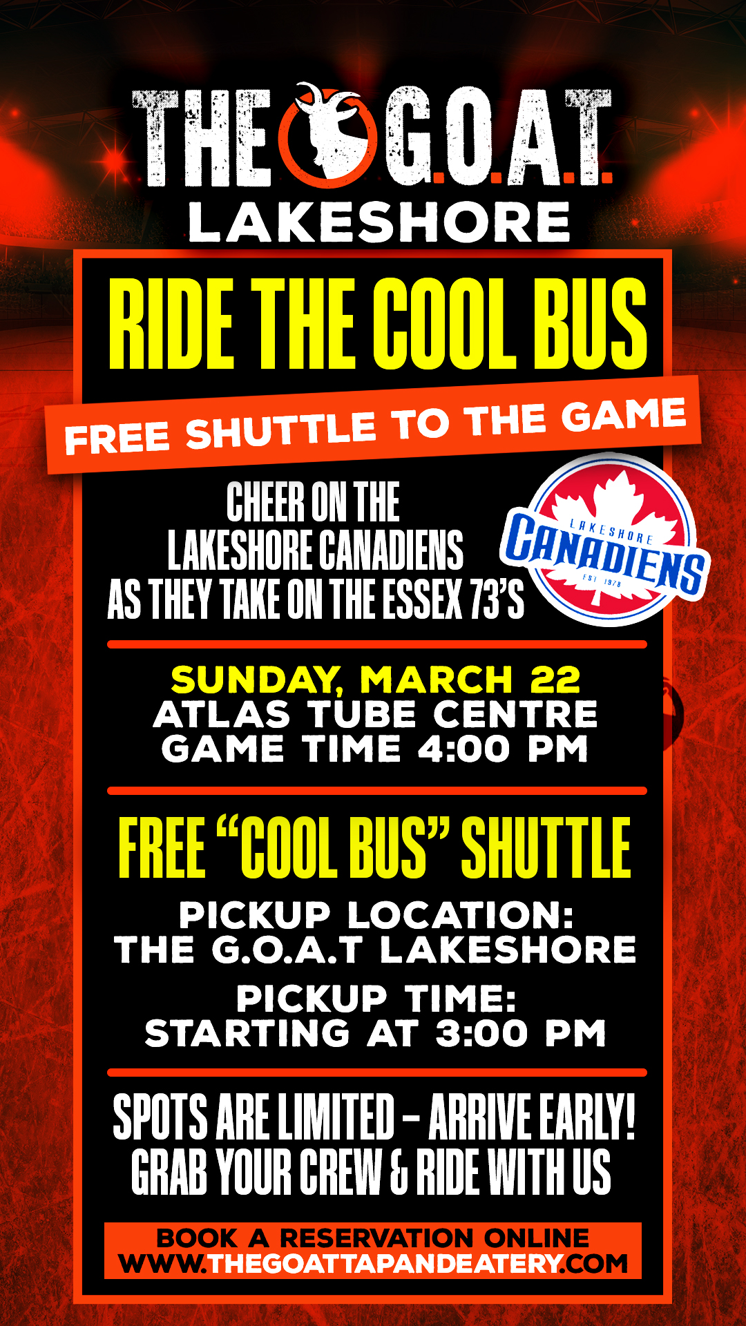 The G.O.A.T Lakeshore is bringing the energy off the ice and straight to the game with our “Cool Bus” — a FREE shuttle experience to cheer on the Lakeshore Canadiens as they take on the Essex 73’s!